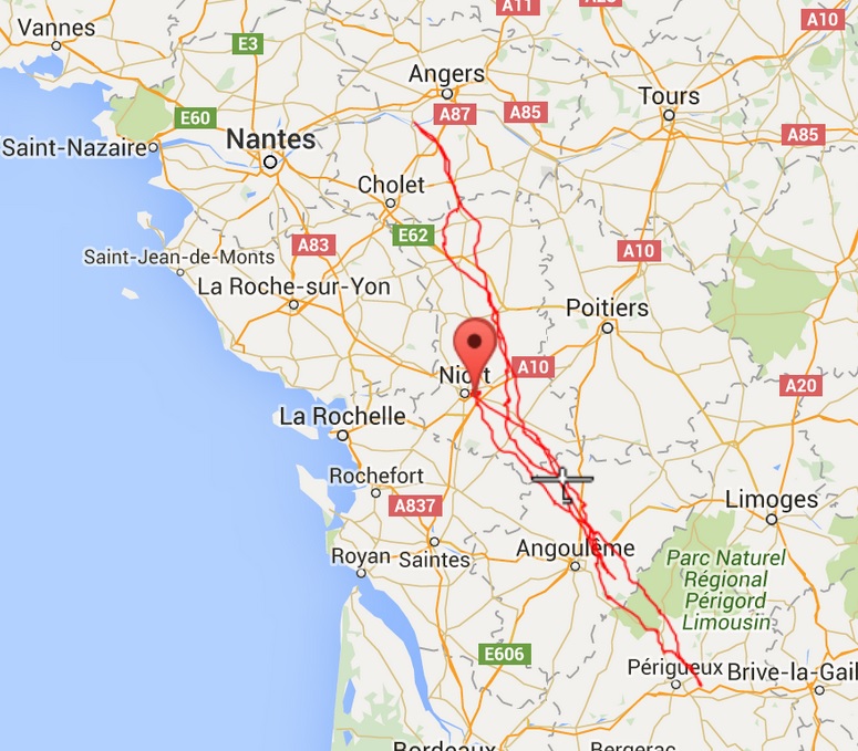Cédric vient de réussir l'exploit de parcourir 755 kms avec une moyenne de 104 km/h. Au départ de Niort il a rejoint Angoulème, puis Angers, Périgueux et retour à Niort. Bravo !